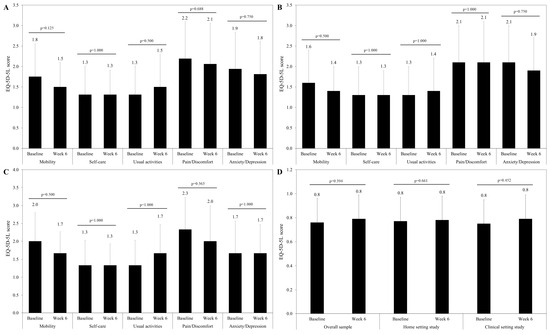 Patient quality of life measured through the EQ-5D-5L questionnaire among the overall sample (A), patients from the home study (B), and patients from the clinical setting study (C), as well as the overall index values (D) at both baseline and after the 6-week study period.