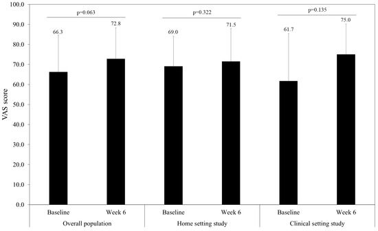 Regarding the effectiveness of the COGNIVITRA device in terms of quality of life, no statistically significant differences were observed in any of the modules of the EQ-5D-5L scale, with improved scores only in the case of the usual activities item in the overall sample (Figure 5A). This lack of statistical significance was also reported among patients from both home (Figure 5B) and clinical setting studies (Figure 5C). An improvement in self-health perception measured through the EQ-VAS scale was also observed, where higher values were obtained after six weeks in both the overall sample and both the home and clinical setting studies, although the difference was not statistically significant (Figure 6).