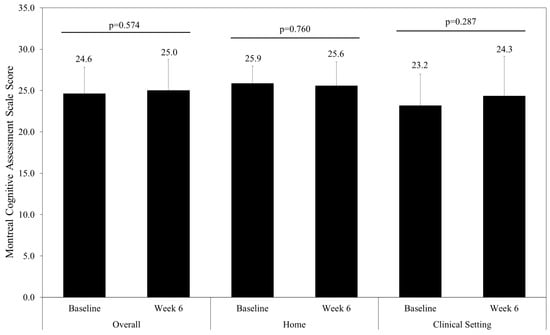 No statistically significant differences were reported in the MoCA scores, which ranged from 0 to 30, with slight improvements in both the overall study (from 24.6 ± 3.2 to 25.0 ± 3.8 after 6 weeks, p = 0.574) and clinical setting study (from 23.2 ± 3.8 to 24.3 ± 4.8 after 6 weeks, p = 0.287). In the case of the home study, a small decrease in the MoCA score was observed (from 25.9 ± 2.1 to 25.6 ± 2.9 after 6 weeks, p = 0.760; Figure 8).
