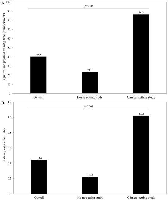Time spent performing the cognitive and physical exercises (A) and patient/professional ratios (B) among the total sample and patients from both the home study and the clinical setting study.