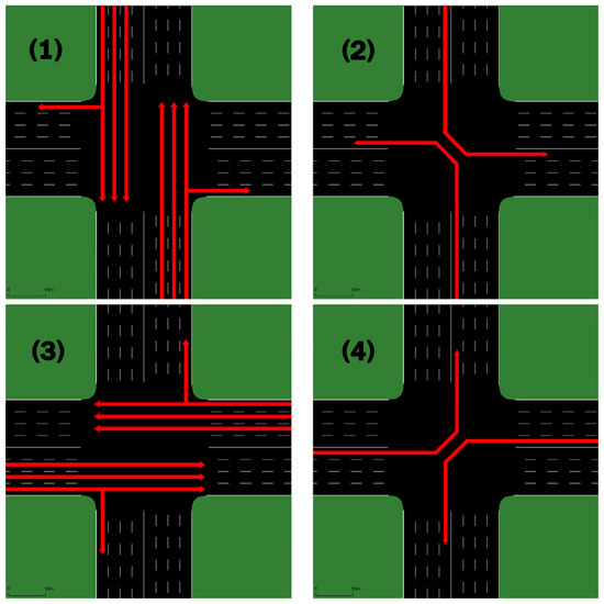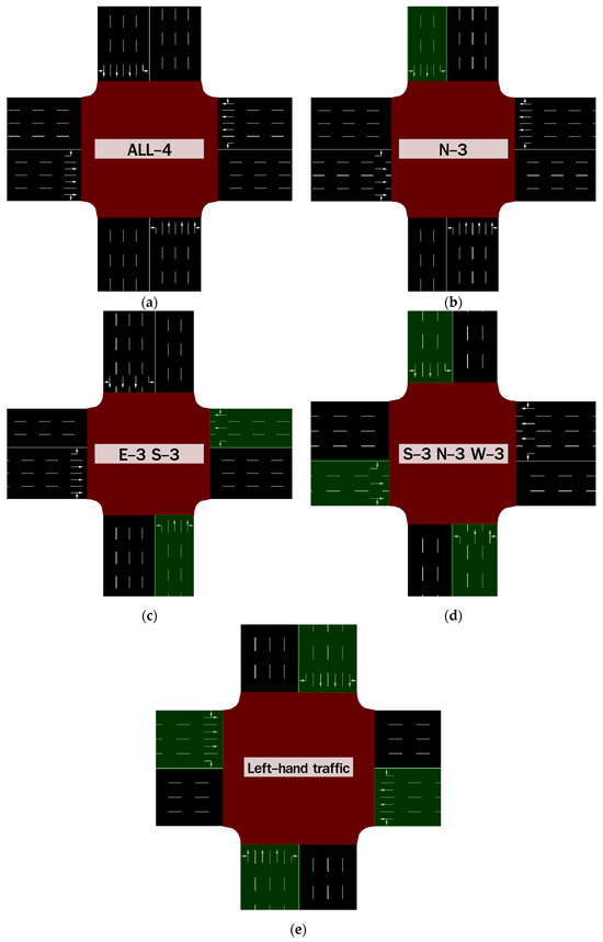 Furthermore, there are several designs for the environment. In the first, each arm has a balanced structure with four lanes. The number of lanes was gradually reduced to three, one arm at a time, by reducing the number of lanes on each arm from all directions to cover each possible design. The last type of traffic design is left-hand driving with four equal lanes across all arms, as shown in Figure 2b–e.