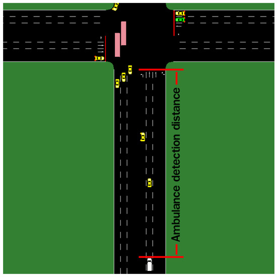 Moreover, there is an ambulance prioritization system that gives priority to ambulances to pass through the intersections first. However, their safety must also be considered. Therefore, it is imperative to consider the safety duration, which refers to the time duration before changing to the green light phase to allow the ambulance to pass, as well as the duration after the ambulance has passed through the intersection and the phase selection returns to normal. The safety duration also affects the detection distance. If the safety duration increases, it is necessary to provide sufficient time for the green light to be activated before the ambulance arrives at the intersection. Consequently, it was necessary to consider the detection distance, as shown in Figure 3.