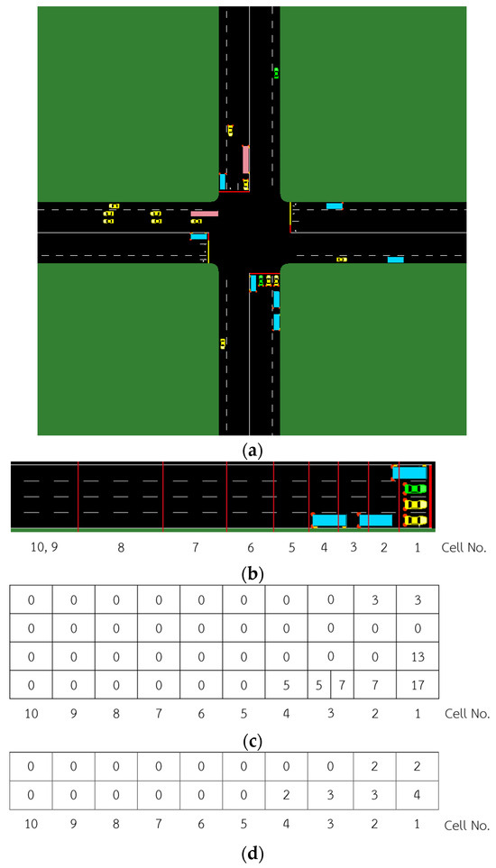 Figure 4 displays an example of a state for the southern side of the intersection. Meanwhile, Figure 4c presents the waiting time of each car, divided into cells based on Figure 4b. If a cell contains more than one vehicle, the highest value within the cell is used for comparison in Table 1 before being stored as part of the state, as depicted in cell 3 of Figure 4c,d.
