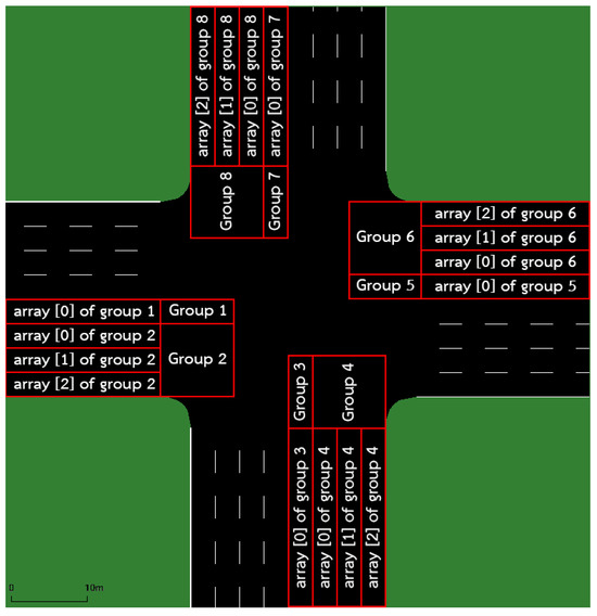 In this study, we used a prototype intersection environment based on a comparison target [29]. The intersection consists of four arms, each with four lanes and a length of 750 m.