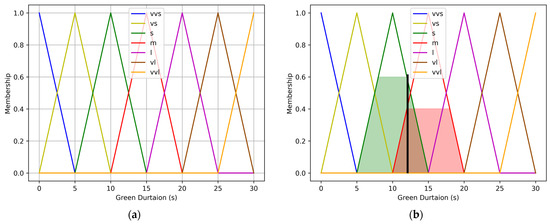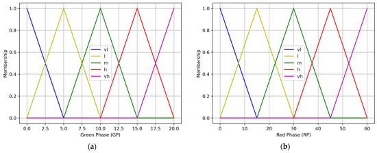 In 1977, Pappis and Mamdani [3] recommended using fuzzy logic as an approach to controlling traffic lights, which was implemented at a single intersection. Subsequently, many researchers have extensively studied the application of fuzzy logic to traffic signal control. Data were collected from various situations at an intersection, such as the number of vehicles waiting at red lights, the number of vehicles at the intersection to be granted green signals [4,5,6], cycle starting time, change probability [5], queue lengths [6,7], waiting time [8], and total number of vehicles [9]. These parameters have also been used to analyze and determine traffic signal phases [5,6], or the duration of green signals [4,7,10].