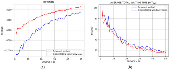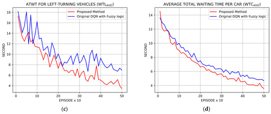 It is noted that the original DQN with the fuzzy logic method yielded worse results than the traditional method compared to vehicles turning left due to the inappropriate reward, in which the traditional method uses a fixed 10 s green signal in a sequence in every phase.