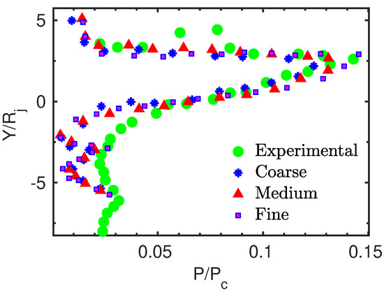 12]. The three different FV grids are made of 0.66 (coarse), 2.7 (medium), and 6.8 (fine) million cells for the whole computational domain. In this plot, the spatial coordinate along the plate is non-dimensionalized by the nozzle exit radius (