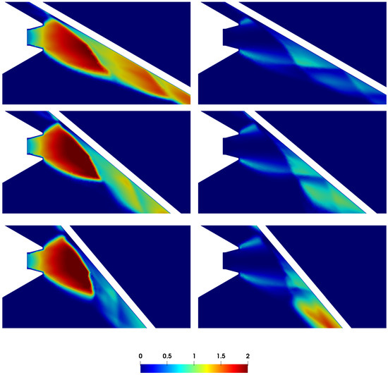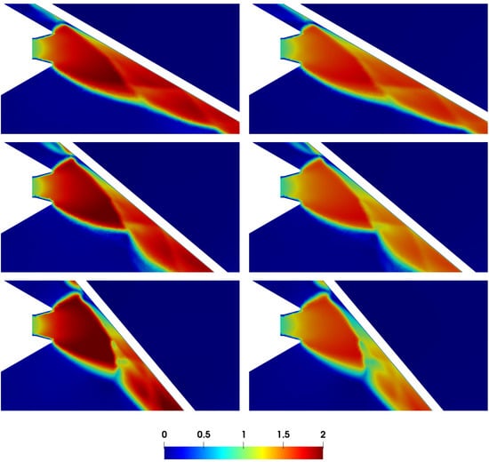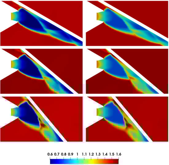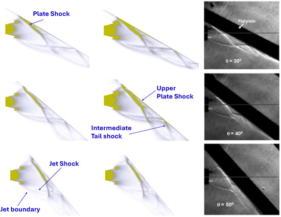 Figure 8, the various flow scenarios associated with different plate inclinations are visualized by reporting the contour maps of the density gradient modulus, making a direct comparison against experimental Schlieren images provided by Nakai et al. [
