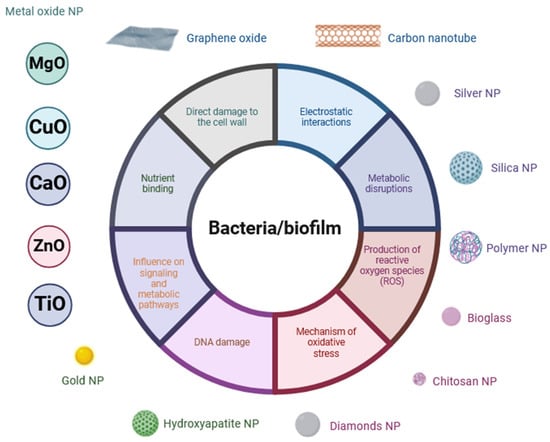 The effect of nanoparticles on the impairment of biofilm-forming bacteria (BioRender.com, accesed on 25 July 2024).