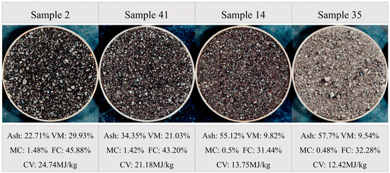 Pseudo-color images (817 nm, 661 nm, and 549 nm) of four coal samples and the measured values of quality indices. The samples are arranged from left to right by CV, from highest to lowest.