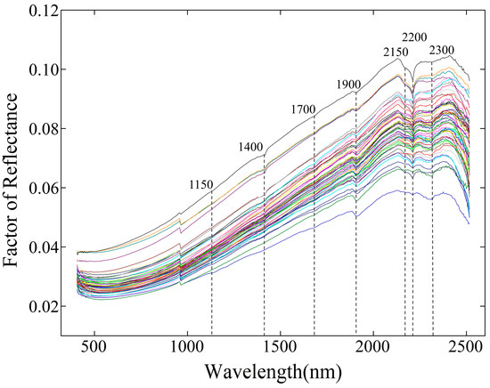 The raw spectra and the preprocessed spectra of all coal samples are shown in Figure 5. From the raw spectra in Figure 5a, it can be found that the spectral curves of the coal samples have similarity in that they have low reflectance in the visible near infrared (VNIR) band and increased reflectance with the shortwave infrared (SWIR) wavelength. The overall reflectance of coal is low, which is attributed to the black appearance of coal caused by the main carbon component. In addition, the absorption and reflection characteristics of the coal spectral reflectance are generally insignificant, and the more prominent spectral peaks and valleys are mainly concentrated in the shortwave infrared region. There are three obvious spectral reflection peaks at 2100 nm, 2250 nm, and 2400 nm. Additionally, the typical spectral absorption valleys can be clearly observed at 1900 nm, 2200 nm, and 2300 nm. In addition, it can be found that there are weak spectral absorption valleys near 1400 nm, 1700 nm, and 2150 nm. Coal is a complicated, mixed solid material, which mainly contains a large amount of organic matter (e.g., aromatic and aliphatic compounds, etc.) and a small amount of inorganic matter (e.g., SiO2, Al2O3, Fe2O3, etc.) [34,36]. The large amount of organic matter in the coal leads to a more pronounced spectral signature. The typical absorption valley at 2300 nm is consistent with a combination of asymmetric stretching and symmetric bending of CH2 and CH3 [34], while the weak spectral absorption valley at 2150 nm is associated with a combination of aromatic C-H stretching and C-C stretching [35]. In addition, the inorganic components of coal have a great influence on the spectra despite the small amount, and the typical absorption at 1900 nm and the weak absorption feature at 1400 nm are mainly due to the first overtone of O-H in the free water, which is closely related to the moisture content of coal. Clay minerals such as kaolinite, which are the host minerals for the inorganic components of coal [36], form a distinct absorption valley near 2200 nm due to the vibration of Al-OH [35]. However, due to the structural differences between the organic and inorganic components of coal, it is difficult to select the characteristic wavelengths directly by manual operation, so it is necessary to select the characteristic wavelength extraction method to extract the characteristic wavelengths of the suitable spectra.