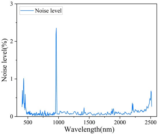 As shown in Figure 4, most wavelengths exhibit low noise ratios of less than 0.5%. The wavelengths with higher noise ratios are located at <465 nm, 954–975 nm, and >2470 nm, where the noise ratios are close to or exceed 1%. This occurs because these wavelengths are located at the edge of the spectrometer’s sensing range (<465 nm and >2470 nm) and the overlap of the two sensors (954–975 nm), resulting in a higher noise ratio. Consequently, wavelengths in the range of <465 nm, >2470 nm, and 954–975 nm were excluded from further analysis, while those with a noise level of less than 0.5% were retained for subsequent analysis.