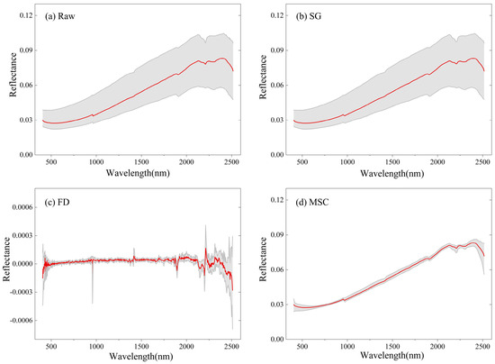 The spectral curves of (a) raw and preprocessed reflectance of all coal samples using (b) SG, (c) FD, and (d) MSC methods. The red curves indicate the mean spectra of all coal samples, and the gray shadows represent the spectra reflectance range.