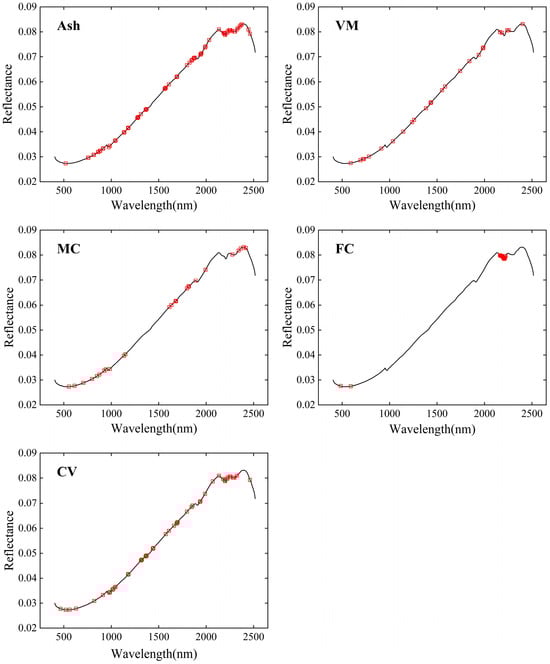 Results of characteristic wavelength extraction (marked by red square). The characteristic wavelengths of Ash, VM, MC, and CV were extracted by CARS. The characteristic wavelengths of FC were extracted by Boruta.