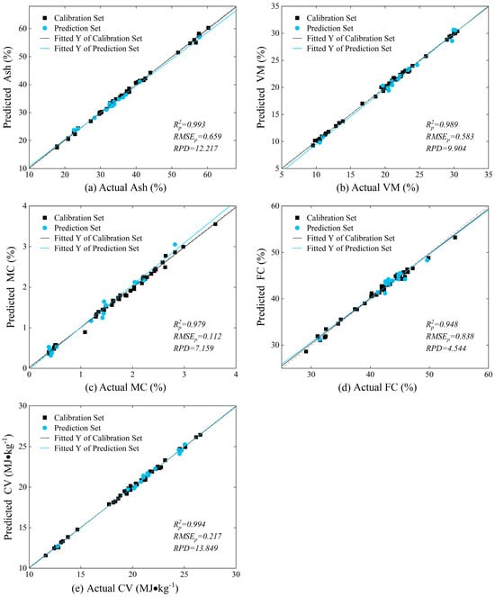 Scatter plots of actual and predicted coal quality indices values obtained using the optimal LSSVR model based on the combined spectra-texture features. (a) Ash; (b) VM; (c) MC; (d) FC; and (e) CV.