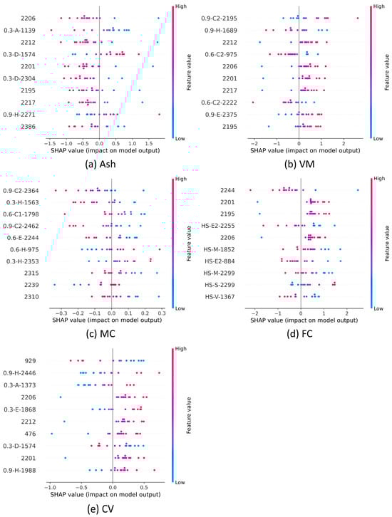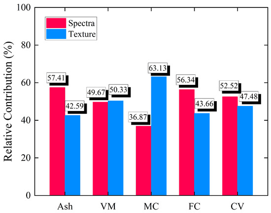 In order to understand the contribution of spectra and texture features to coal quality indices prediction, SHAP values of different variables were calculated by applying Python’s SHAP library. Figure 8 shows the contribution values of the top 10 variables in coal quality index prediction sorted by importance, where red dots represent higher values and blue dots represent lower values. For instance, Ash can be found to increase with decreasing spectra reflectance at 2206 nm, 2212 nm, 2201 nm, 2195 nm, 2217 nm, and 2386 nm. The typical absorption valley of inorganic minerals such as kaolinite is located near 2200 nm, where lower reflectance indicates a higher inorganic mineral content, which corresponds to increased ash in coal. Figure 9 shows the relative contribution of spectra and texture features in the prediction of coal quality indices calculated from the average absolute SHAP values. As shown in Figure 9, the contribution of spectral features is significant in predicting Ash, FC, and CV, while both spectral and texture features contribute equally to VM. In contrast, the contribution of texture features is much greater than that of spectral features in MC. Section 3.4 reveals that the difference in between the model with combined features and the model with spectra features is much smaller for Ash (0.009), VM (0.018), and CV (0.003) than for MC (0.207) and FC (0.039). Therefore, when combining the spectral modeling accuracy (Table 4), variable contributions (Figure 9), and the above analysis, it can be concluded that Ash, VM, and CV can generally achieve high-precision predictions using only spectral features, whereas MC and FC require modeling with combined spectral-texture features. This may be attributed to the two metrics being more sensitive to the textural changes of the coals. These findings could serve as a reference for tasks involving different coal detection requirements.