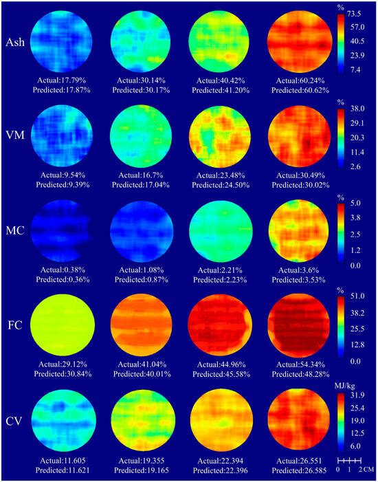 By applying the optimal model to the pixel-by-pixel analysis of coal hyperspectral images, the distribution of coal quality indices is visualized. Specifically, for prediction at each pixel, a mask region centered on the pixel is selected. Then, the features within the region are extracted according to the feature extraction method before and finally imported into the optimal model for the prediction. The predicted values of all pixels are sorted by their original positions to generate a total predicted image. Finally, the maximum and minimum values of this image are used to set the color palette, and the visualization of coal quality indices is produced by assigning colors to the predicted values based on the color palette.