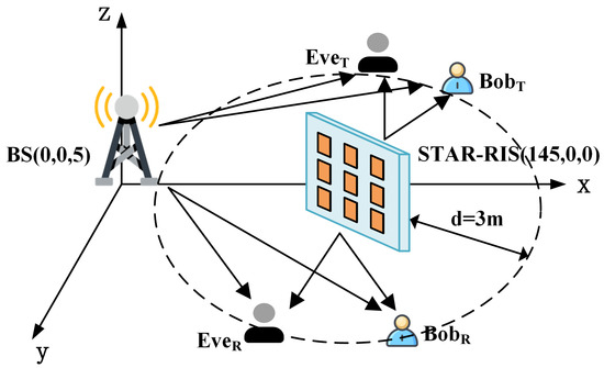In this section, we present numerical results to compare the performance of the proposed algorithm with four benchmark scenarios. WSSR is a crucial performance metric for PLS. Next, we discuss the impact of various variables on the performance of WSSR. The three-dimensional (3D) simulation setup is illustrated in Figure 2, where BS and STAR-RIS are positioned at and meters, respectively. Bobl and Evel are randomly distributed along a semicircle centered on STAR-RIS with a radius of m. The STAR-RIS is located at the center of this semicircle. In the simulations conducted, the narrow-band quasi-static fading channels extending from the BS to the STAR-RIS are characterized as Rician fading channels in the ensuing manner [29].