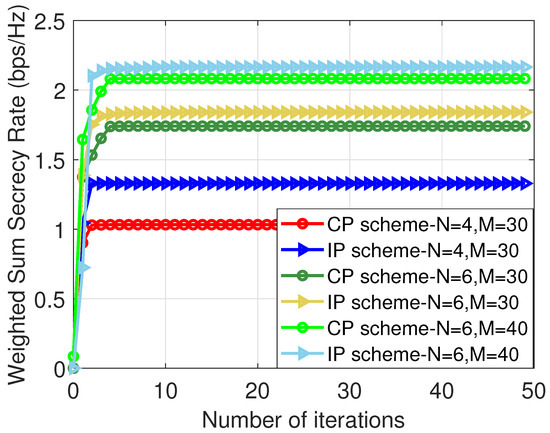 Figure 3 depicts the convergence performance of the proposed algorithm with different M and N. From this figure, we observe that the WSSR stabilizes within approximately 5 iterations. An intuitive explanation for this result is that the direct link offers improved initial channel conditions, allowing the optimization algorithm to identify a superior solution more quickly during the initial stage, which accelerates the overall convergence process. Additionally, the reasonable setting of channel parameters and the low computational complexity of the proposed algorithm further enhance its rapid convergence. It is discerned that the WSSR exhibits a monotonic augmentation concomitant with the iterative process and culminates in equilibrated solutions after a finite number of iterations, and the iterative process converges more quickly. In addition, larger M, N achieves a higher WSSR at the cost of slower convergence speed, since more variables need to be optimized. Due to coupling constraints, the WSSR with independent phase shift is slightly larger than the WSSR with coupled phase shift.