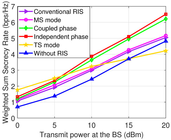Figure 4 evaluates the WSSR attained by various methodologies in relation to the allocated transmit power budget, TS surpasses IP and CP in security at low power due to its inherent wiretap avoidance and clear decoding. However, as power rises, IP and CP’s efficient time use prevails, which diminishes the reception capability of eavesdroppers, leading to greater secrecy at high power levels. IP scheme exhibits higher WSSR at all transmit power levels, which shows that the IP scheme is more efficient in exploiting the transmit power to enhance the secrecy rate, specifically because its phase shifts can be adjusted independently with higher design freedom to achieve higher secrecy rates. However, in exchange for complex hardware implementations that increase the difficulty and cost of implementing the system. The CP scheme outperforms C-RIS and MS in secrecy efficacy. The WSSR of CP is slightly lower than that of IP due to the effect of coupling phase shift. The CP scheme may not perform as well as the IP scheme, especially in scenarios where elaborate beamforming and high secrecy performance are required. Calculations show that the average error in confidentiality rates for the CP and IP schemes is under 3 percent.