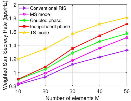 In Figure 5, we can find that the WSSR increases with M for all these schemes. C-RIS lag due to limited degrees-of-freedom (DoFs) from their fixed transmission/reflection choice, widening the performance gap with STAR-RIS as M grows. This comparison validates STAR-RIS’s utility in wireless networks. TS naturally avoids mutual eavesdropping between users through time switching, which is particularly important in multi-user scenarios. The advantage becomes much more apparent as the amount of factors increases. MS outperforms the C-RIS. This is due to the fact that in a broadcast communication scenario, MS experiences no inter-user interference and can leverage the entire available communication time to enhance WSSR. The WSSR of MS and C-RIS, while also increasing with M, is not as significant as that of the CP and IP schemes. This is because their phase shift strategies are more rigid and lack the flexibility needed to fully optimize the signal transmission path. The performance of CP is slightly lower than that of IP as the number of elements increases. This is because the phase shifts of neighboring units in the CP scheme are constrained, resulting in fewer degrees of freedom in the system. Consequently, IP can manage and reduce interference more efficiently, especially in multi-user scenarios. Due to phase-shift constraints, CP may not eliminate interference, thereby affecting the WSSR.