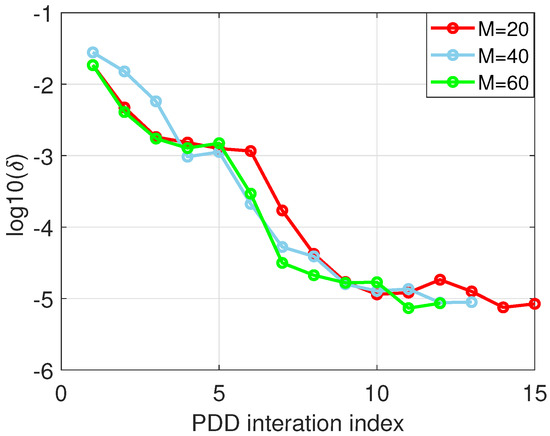 Figure 6 illustrates the convergence behavior of the PDD procedure to update . The value of the penalty pair function decreases with iterations for different numbers of STAR-RIS elements. The PDD algorithm demonstrates good convergence within twenty iterations, with a threshold set at . Additionally, the convergence is not sensitive to variations in M.