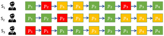 The answer sequences of three students. Different colors represent different results, where green, yellow, and red indicate correct, time-out, and incorrect results, respectively.
