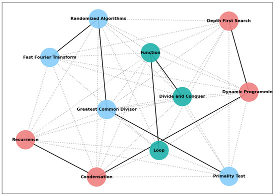 We extract a portion of the constructed knowledge graph, as shown in Figure 3; the knowledge graph represents different KCs and their interrelationships. For instance, under the category “Dynamic Programming”, concepts such as “Depth First Search” and “Recurrence” are connected, reflecting their related nature. Nodes with the same color are assigned to the same knowledge category, indicating their thematic connections. The lighter, dashed edges are used to illustrate connections between different categories, emphasizing the interconnectedness of programming concepts across various topics.