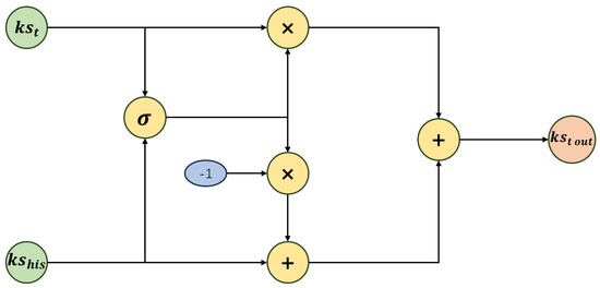 In this study, is used to represent the current level of knowledge mastery for a student, reflecting their present knowledge state. Meanwhile, the student’s historical knowledge state is also considered a significant indicator of their knowledge mastery. Therefore, we introduce a learnable gating mechanism, denoted as g to balance the importance between and . The final knowledge state acquisition process is illustrated in Figure 5, and the detailed computation process is as follows: