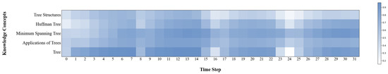 In the heatmap, the color intensity represents the depth of the student’s mastery: lighter colors indicate lower mastery levels, while darker colors signify a deeper understanding. As the student progresses through time steps 0 to 7, the heatmap block corresponding to the KC “Tree” gradually deepens in color. This deepening suggests that the student’s understanding of the “Tree” concept is improving steadily. Simultaneously, the heatmap blocks for related KCs such as “Tree Structures”, “Huffman Tree”, “Minimum Spanning Tree”, and “Applications of Trees” also show deepening colors. This indicates that the student’s mastery of these interconnected concepts is strengthening alongside their understanding of “Tree”.