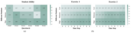 We visualize the learning abilities of three students across six exercises in Figure 7a. In this heatmap, darker colors represent higher learning ability on the respective exercise, while lighter colors indicate lower learning ability. Among the three students selected, we observe different overall levels of learning ability: excellent, moderate, and lower.