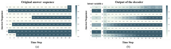 The left half of Figure 8b represents the latent variables obtained after processing the student’s answer sequence through the VAE’s encoder, which is a part of our model’s input and clearly reflects the personalized and refined representation of the student’s continuous responses to each programming exercise. The higher value indicates the faster mastery of the problem-solving process for that particular exercise. We also visualize the output of the hidden layer after passing through the VAE’s decoder, as shown in the right half of Figure 8b. It can be observed that the VAE effectively reconstructs the latent variables. For exercises where the student initially answered incorrectly and then correctly after multiple attempts, the gradient of the values reflects the student’s gradually improving mastery of the exercise throughout the answer sequence. Additionally, the different number of attempts is differentially reflected in the answer sequence.