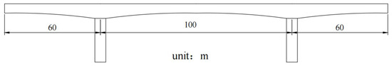 The Tianjin–Qinhuangdao High-Speed Railway construction project, a ballasted track, prestressed concrete, two-row continuous girder bridge, is the engineering example chosen to illustrate a bridge using the cantilever casting method of construction. The total length of the beam is 221.5 m, the calculated span is 60 + 100 + 60 m, the height of the beam at the centre pivot point is 7.85 m, the height of the beam in the 10 m straight section in the middle of the span and the 15.75 m straight section in the side span is 4.85 m, and the bottom edge of the beam is varied according to a quadratic parabola. The schematic diagram is shown in Figure 3.