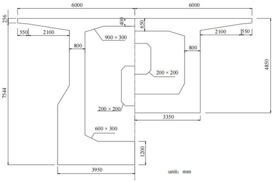 The girder is a single-box, single-compartment, variable-height, variable-section structure. The top width of the box girder is 12.0 m; the bottom width of the box girder is 6.7 m; the thickness of the top plate is 40 cm, except near the end of the girder; the thickness of the bottom plate is from 40 to 120 cm and varies linearly according to a straight line; and the thickness of the web plate is from 60 cm to 80 cm, while the width of the web plate varies from 80 cm to 100 cm according to a folding line, as shown in Figure 4. There are five transverse partitions at the end pivot, mid-span pivot, and centre pivot of the whole girder, and the transverse partitions are equipped with hollows for inspectors to pass through.