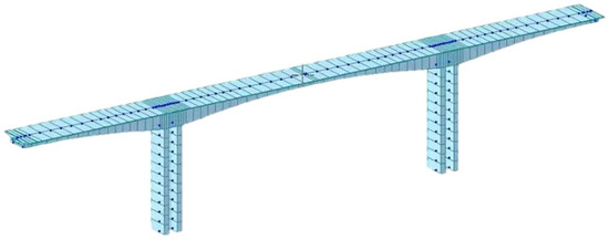 Before using the mathematical model to predict the pre-camber, in order to ensure the smooth progress of the monitoring process, the deformation of the structure needs to be calculated and verified to obtain a theoretical value of the bridge deformation, which, in this paper, is modelled using MIDAS Civil 2021 software. The nodes were divided according to the construction sections of the design drawings, so 16 construction phases were set up, with a total of 86 nodes in the whole bridge, and a rigid connection was adopted between the abutment and Block 0. The established finite element model is shown in Figure 6.