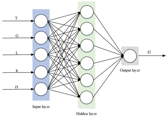 - The five sets of parameter prediction results of the GM(1,1) model are used as the input parameters of a BP neural network, and the actual vertical mould’s pre-camber is used as the output parameter of the BP neural network, i.e., the number of neurons in the input layer and the output layer of the BP neural network are five and one, respectively, and, after repeated experiments, the training error is minimal when the number of neurons in the implied layer is six. Therefore, in this paper, we establish a three-layer BP with the structure of a 5-6-1 neural network model. The structure of the neural network is shown in Figure 7.