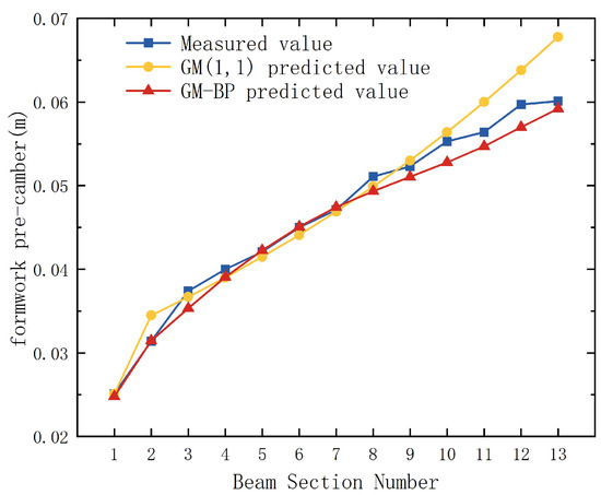 The results of the comparison between the predicted and measured pre-camber values of the two prediction models for the vertical mould pre-camber of the 11#–13# girder sections of the bridge are shown in Table 3. It can be seen that the accuracy of the GM-BP prediction model is more obviously improved compared with that of the GM(1,1) model. Its average relative error is reduced from 8.69% to 3.01%, and the minimum relative error of the GM(1,1) model is 6.38% larger than that of the maximum relative error of the GM-BP model, 4.52%, which indicates that this method can effectively improve the predictions’ accuracy and stability.