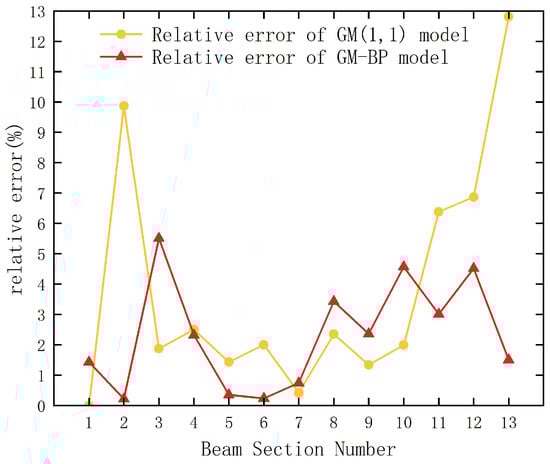 As can be seen from Figure 8, although both prediction models can truly reflect the variation rule of the pre-camber, the GM(1,1) prediction model has individual girder segments with large errors, especially in the prediction results of the 11#–13# girder segments, which display large discrepancies with the measured values. The GM-BP combined prediction model, on the other hand, demonstrates a high degree of agreement between the predicted and measured values, and there is no significant increase in dispersion. As can be seen from Figure 9, the relative error of the GM(1,1) prediction model fluctuates greatly, and the relative error in the 13# beam section reaches 12.81%, while the fluctuation amplitude of the GM-BP combined prediction model is relatively smooth, and its maximum relative error is 5.51% in the 3# beam section, which is not easily affected by the irregularity of the original data. This shows that the GM-BP combined prediction model can better combine the advantages of the two methods used, can deal with the multi-parameter coupling problem in the case of less data, has a higher accuracy in linear predictions of the bridge construction process, and is more stable.