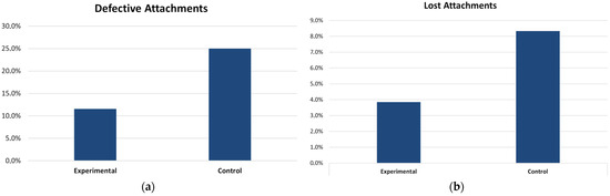 Descriptive statistics showed that the experimental group had three attachments with morphological defects (11.5%), corresponding to premolars (n = 1) and molars (n = 2). In comparison, the control group showed altered morphologies in six attachments (25%) on incisors (n = 4), canines (n = 1), and molars (n = 1). The Fisher test showed no significant differences (p = 0.281) (Figure 2a). Regarding the detachment of the auxiliary elements from tooth surfaces after their placement, the experimental group showed a detached attachment (3.8%), corresponding to a molar tooth. In the control group, two detached attachments corresponding to incisors (n = 1) and canines (n = 1) were observed (8.3%). The Fisher test showed no significant differences (p = 0.602) (Figure 2b).