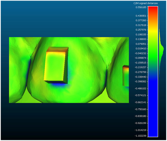 From the analysis of deviations, a colorimetric map was obtained showing the maximum deviations from the reference model. The composite defects (missing areas) around the attachment are represented in blue, while the excesses of composite resin are highlighted in red (Figure 3).