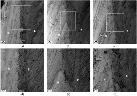 SEM observations of the resin–enamel interface in three samples from the experimental group. Interface areas were marked at (a) 840×, (b) 590×, and (c) 770×. Surface adhesion between enamel (E) and resin (R) without gaps, cracks, or air bubbles is visible in (d) 1750×, (e) 1700×, and (f) 1900×.