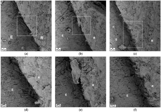 SEM observations of the resin–enamel interface in three samples from the control group. Interface areas were marked at (a) 720×, (b) 610×, and (c) 620×. Non-integration between enamel (E) and resin (R) with gaps, cracks, and air bubbles is visible in (d) 1850×, (e) 1800×, and (f) 1850×.