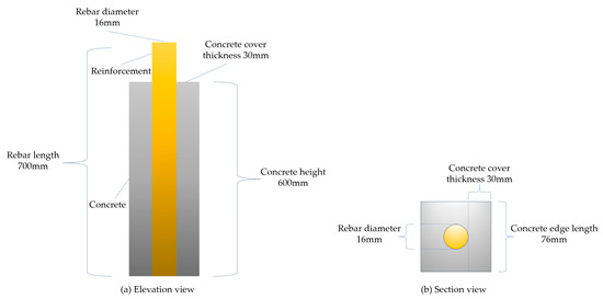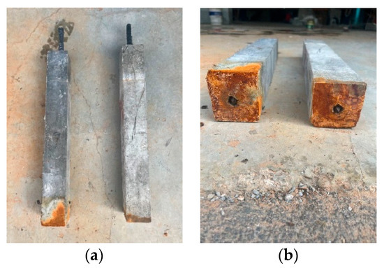 Nine normal concrete specimens (N1–N9) and nine UHPC specimens (U1–U9) were fabricated for the experiment. To accurately reflect the actual corrosion condition of the reinforcement within the columns, the specimens used 16 mm diameter steel bars, the same as those used in the columns. The cover thickness was 30 mm, and no cover was applied at the bottom of the specimens to simulate the joint surface. The specimen dimensions are shown in Figure 2.