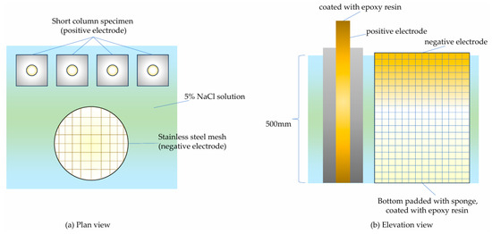 The specimens were placed on one side of the solution tank, and the stainless steel mesh (negative electrode) was fixed on the opposite side of the tank. The top steel bars of the short columns and the stainless steel mesh were connected to the positive and negative terminals of the power supply, respectively. A layer of epoxy resin was applied at the connection points, and after it solidified, they were wrapped with insulating tape. A 5% sodium chloride solution was added to a height of 500 mm and allowed to stand for 3 days before accelerated corrosion started. The accelerated corrosion testing process is shown in Figure 4.