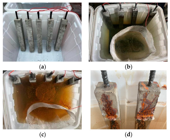Accelerated corrosion testing process: (a) wiring of the specimens; (b) addition of sodium chloride solution; (c) corrosion products’ accumulation and precipitation; and (d) corrosion condition of short columns.