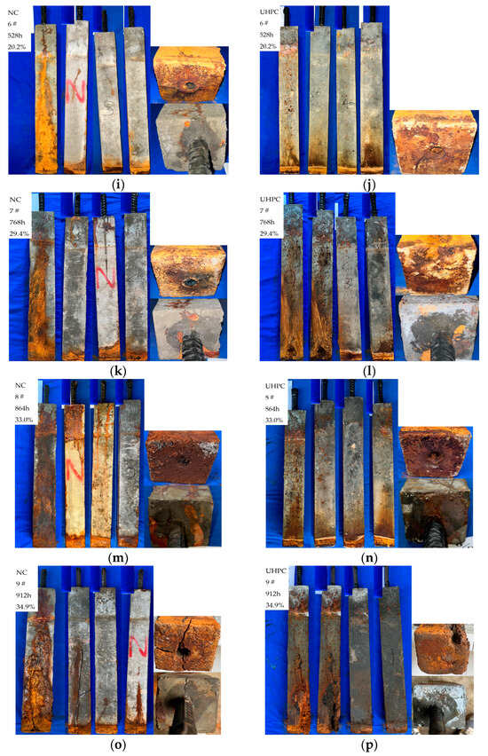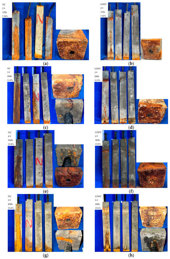 The corrosion extent in the NC specimens was more pronounced compared to the UHPC specimens. On one hand, UHPC has a lower chloride ion permeability, leading to a significantly lower steel reinforcement corrosion rate in the early stages of accelerated corrosion. On the other hand, UHPC has better crack resistance compared to normal concrete, resulting in the delayed cracking of the UHPC specimens. The research results are similar to the findings of Zheng et al. [45], who observed that, as the degree of corrosion increases, concrete specimens develop more extensive cracks, often resulting in through-cracks from top to bottom.