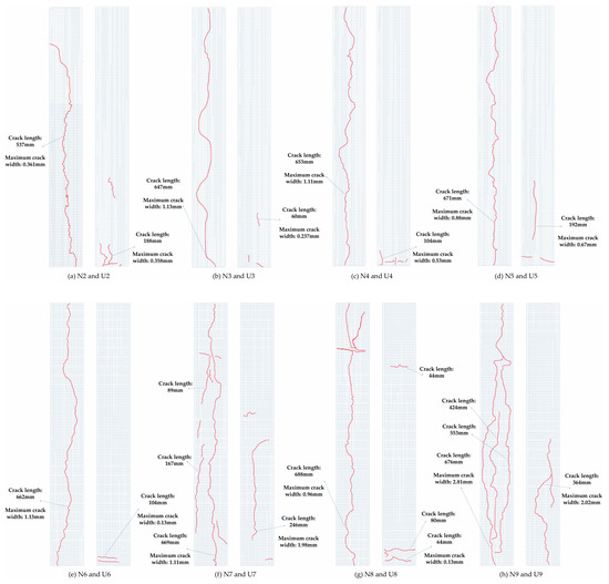 The corrosion conditions of normal concrete (NC) and UHPC short columns are shown in Figure 5 and Figure 6, respectively. The diagram of the cracks in the NC and UHPC specimens is shown in Figure 7.