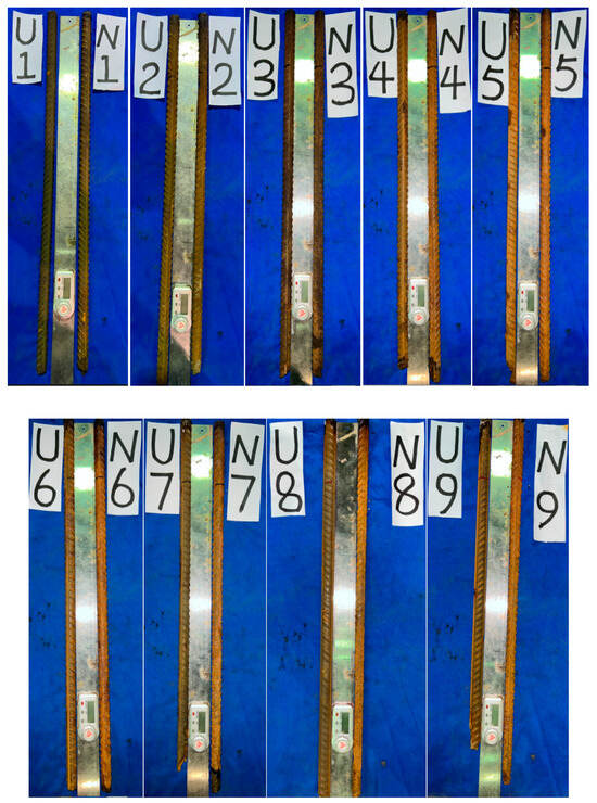 For the UHPC specimens, the reinforcement in specimen U2 exhibited pitting corrosion on the surface. Subsequently, corrosion progressed slowly without significant uneven corrosion; however, the corrosion at the bottom of the reinforcement was more severe compared to the concrete specimens, with noticeable reductions in both the cross-sectional area and length. From specimen U6 onward, uneven corrosion began to appear at the bottom of the reinforcement. As the electrification duration increased, the corrosion phenomena moved upwards, with corrosion products mainly concentrated on the side of the corrosion cracks. Similar to the experimental results in this paper, Zheng et al. [45] also found that the corrosion of a reinforcement is more severe in locations where cracks develop in the concrete. Furthermore, as the degree of corrosion increased, the cross-sectional area of the reinforcement also decreased.