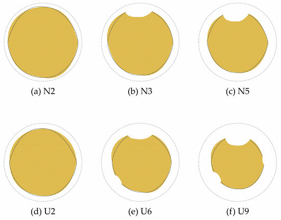 For the concrete specimens, the reinforcement in the N2 specimen shows pitting corrosion on its surface. In the N3 specimen, noticeable uneven corrosion appears at the bottom of the reinforcement, with the cross-sectional area of the reinforcement on the side of the concrete cracks reducing significantly more than in other directions. Starting from the N5 specimen, the instances of uneven corrosion decrease, and the reinforcement exhibits more uniform corrosion along the cross-section. The cross-sectional corrosion of the reinforcement is illustrated in Figure 9.