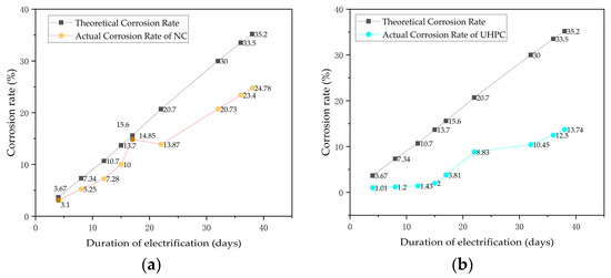 The relationship between the duration of electrical corrosion and the corrosion rate for concrete and UHPC short columns is shown in Figure 10. The theoretical corrosion rate and the actual corrosion rate in the figure have been calculated based on Equation (8) and Equation (9), respectively. The actual corrosion rate of the concrete specimens remains below the theoretical value throughout the corrosion process. Due to earlier cracking in the NC specimens, the rate of increase in steel reinforcement corrosion remains relatively stable, around 70% of the theoretical value. For the UHPC specimens, the corrosion rate increases very slowly in the early stages; as cracks develop, the rate of corrosion acceleration gradually increases, and, after 30 days, the corrosion rate for the UHPC specimens stabilizes around 40% of the theoretical value. This indicates a significant difference in the corrosion rate trends between the UHPC and concrete specimens. Similar to the conclusions from the above studies, research by Yalciner et al. [46,47] found that the actual corrosion rate of ordinary concrete after accelerated rusting is approximately between 60% and 70% of the theoretical corrosion rate. Additionally, Hakan’s study showed that concrete with a higher strength exhibited a lower corrosion percentage and was less prone to crack development after accelerated rusting [48].